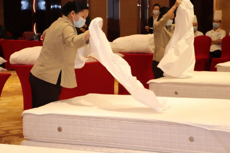 7 月 25 日,酒店 5 楼瑞盛厅铺设起了多张标准客床,技能大赛之中式铺床比赛正激烈开展,房务部客房组全体人员及其他部门员工组成的多技能组选手在这里同台竞技,角出最佳铺床能手。客房组全体人员参与专业组比赛,3 分 30 秒完美呈现中式铺床技巧,来自其他部门的员工组成多技能组比赛,5分钟秀出中式铺床成果。赛前相互搭档,老带新学习培训及实操;赛中分秒必争,各显神通,更有青出于蓝胜于蓝之势。经过比拼,有 6 名选手脱颖而出,房务部客房组李浪、张会丽和胡艳分别荣获专业组一、二、三等奖,保安部孙金水、餐饮部潮菜馆许可立、环卫部汤美芳分别荣获多技能组一、二、三等奖。